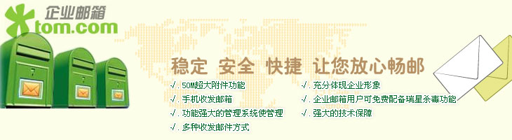 | 企业邮箱就是用企业自己的域名为后缀的收费电子邮箱,比如企业的域名是abc.com,那么企业邮箱的E-mail地址就是abc@abc.com。企业邮箱除了继承了所有的TOM企业邮箱的功能之外,我们开特意开发了很多为企业用户度身定做的功能,这些功能能有效的提供企业的工作效率。 |