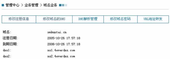 2、 登录域名控制面板,页面将显示域名注册信息及功能菜单,名独立控制面板所具备的功能与管理中心域名DNS管理相同。点击每一个功能菜单,可进入相应的操作界面,操作方式也同管理中心域名DNS管理,也可以在此修改域名的管理密码。