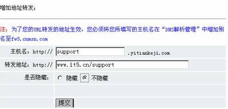 *若选择“不隐藏”,则在知道到页面后,地址栏中显示的地址将会保持为http://www.it5.cn /support;选择隐藏的话需要通过审核后方能生效,我司域名暂不提供主机名为空的URL转发。